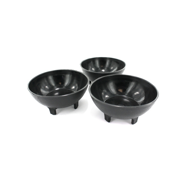 Perfect for parties, picnics or adding Mexican flair during dinner, this 3-piece Salsa Bowls Set features black bowls made of durable plastic with four legs for balance. Each bowl measures approximately 5" wide with a depth of 1 3/4" and can hold up to 12 ounces. Comes packaged in a net bag with a hang tag.,Salsa Bowls,Tazones De Plastico 3Pzas