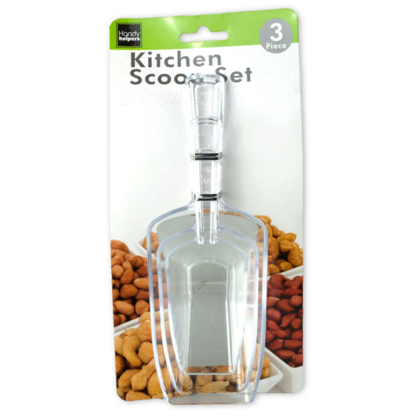 Perfect for scooping cereal, oatmeal, coffee, sugar and more, this 3-piece Kitchen Scoops Set features easy to use squared scoops made from high quality clear plastic in assorted sizes. Measurements for each scoop: Small scoop is 5 3/8" long with scoop dimensions 3 1/4" x 1 3/4" tapering to 1" at lip x 3/4" depth. Medium scoop is 6 3/8" long with scoop dimensions 3 7/8" x 2 1/4" tapering to 1 3/8" at lip x 1 1/4" depth. Large scoop is 7 1/2" x 2 5/8" long, tapering to 1 3/4" at lip x 1 1/2" depth. Dishwasher safe. Comes packaged to a tie card.,Plastic Kitchen Scoops,Palas Servidoras 3Pzas