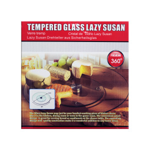 A hard-working piece of kitchen decor, this convenient Tempered Glass Lazy Susan can be used in the kitchen, dining room or even in the game room to hold snacks for the big game. Convenient swivel design ensures ease of use and makes it great for holding a number of items and keeping them at hand. Glass top is easy to clean and adds a stylish look. Durable aluminum base provides stability. Rotates 360 degrees. Heat resistant to 240 degrees Celsius. Measures approximately 10" in diameter. Comes packaged in an individual box. Box measures approximately 10.25" x 1.375" x 10.25". ,Tempered Glass Rotating Dish,
