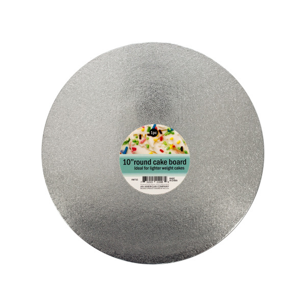 Ideal for lighter weight cakes, this 10" Round Cake Board makes moving cakes easy and features an attractive textured foil covering for enhanced display. Comes shrink wrapped with a hang tag.,Round Cake Board,