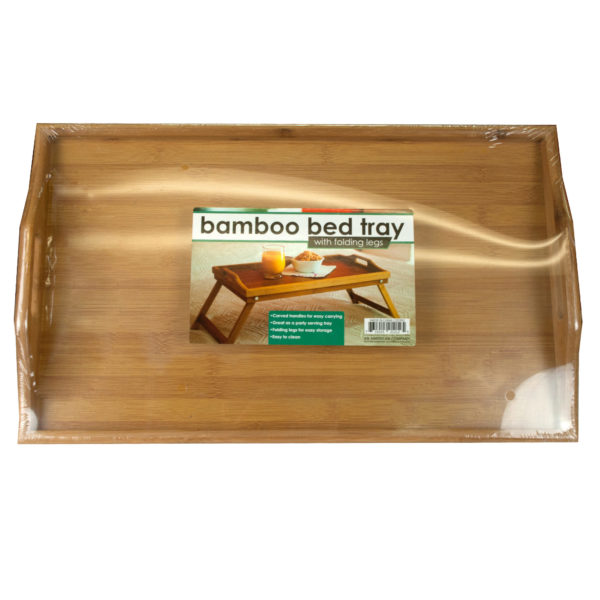 Perfect for breakfast in bed or using as a party serving tray, this attractive Bamboo Bed Tray with Folding Legs features a sleek bamboo tray with carved handles for easy carrying and folding legs for easy storage. Easy to clean. Measures approximately 19.75" x 12" with 8" long legs. Comes shrink wrapped.,Bamboo Bed Tray with Folding Legs,