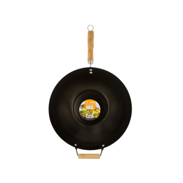 Prepare your food to perfection with this high quality iron 13" Wok with an Easy to Clean Coated Surface. Classic, durable design features a heavy gauge metal cooking surface and two wooden, metal reinforced handles. Perfect for stir frying, braising, steaming and deep frying. Ideal for gas and electric stoves, low to medium heat. Comes loose in a bubble sleeve with cardboard protectors.,Wok with Easy to Clean Coated Surface,