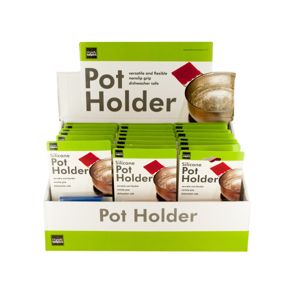 Ideal for covering and holding pot handles, this convenient Silicone Pot Holder features a durable silicone wraparound piece to place over handles to prevent burns. It is versatile and flexible with a non-slip grip. Dishwasher safe. Measures approximately 3" x 3". Comes in assorted colors. Countertop display comes with 24 pieces.,Silicone Pot Holder,
