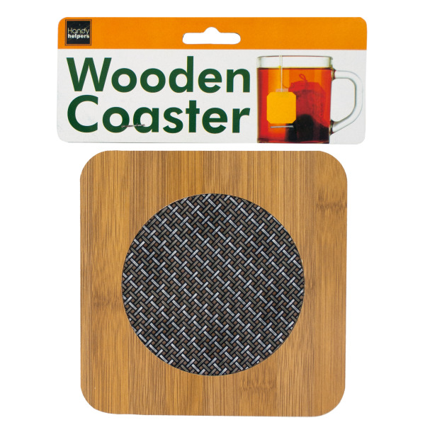 Great for hot and cold drinks, this Wooden Coaster features a square composite wood coaster with rounded edges, a circular basket weave center to keep drinks in place and foam feet on the bottom for stability. Measures approximately 6" x 6". Comes packaged in a poly bag with a header card.,Wooden Coaster with Basketweave Pattern,